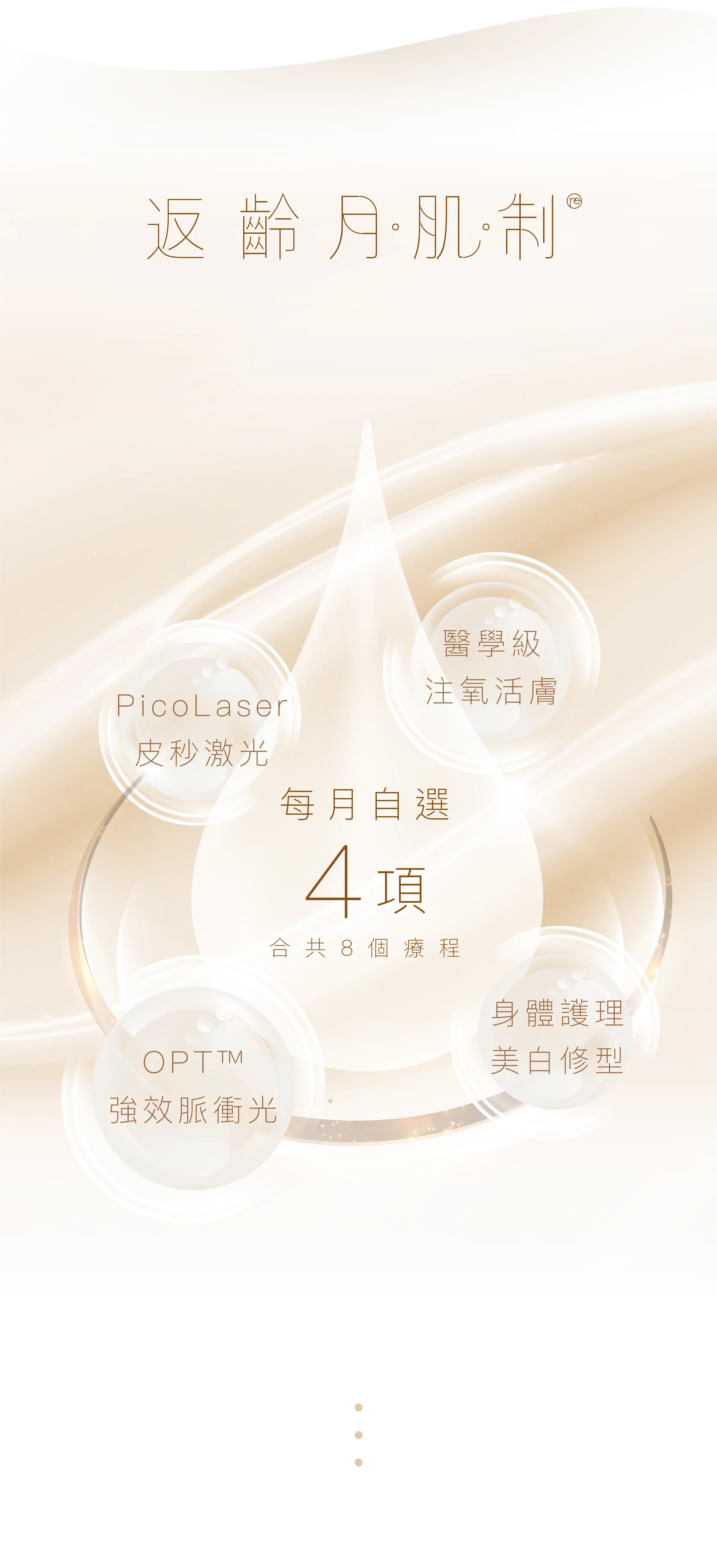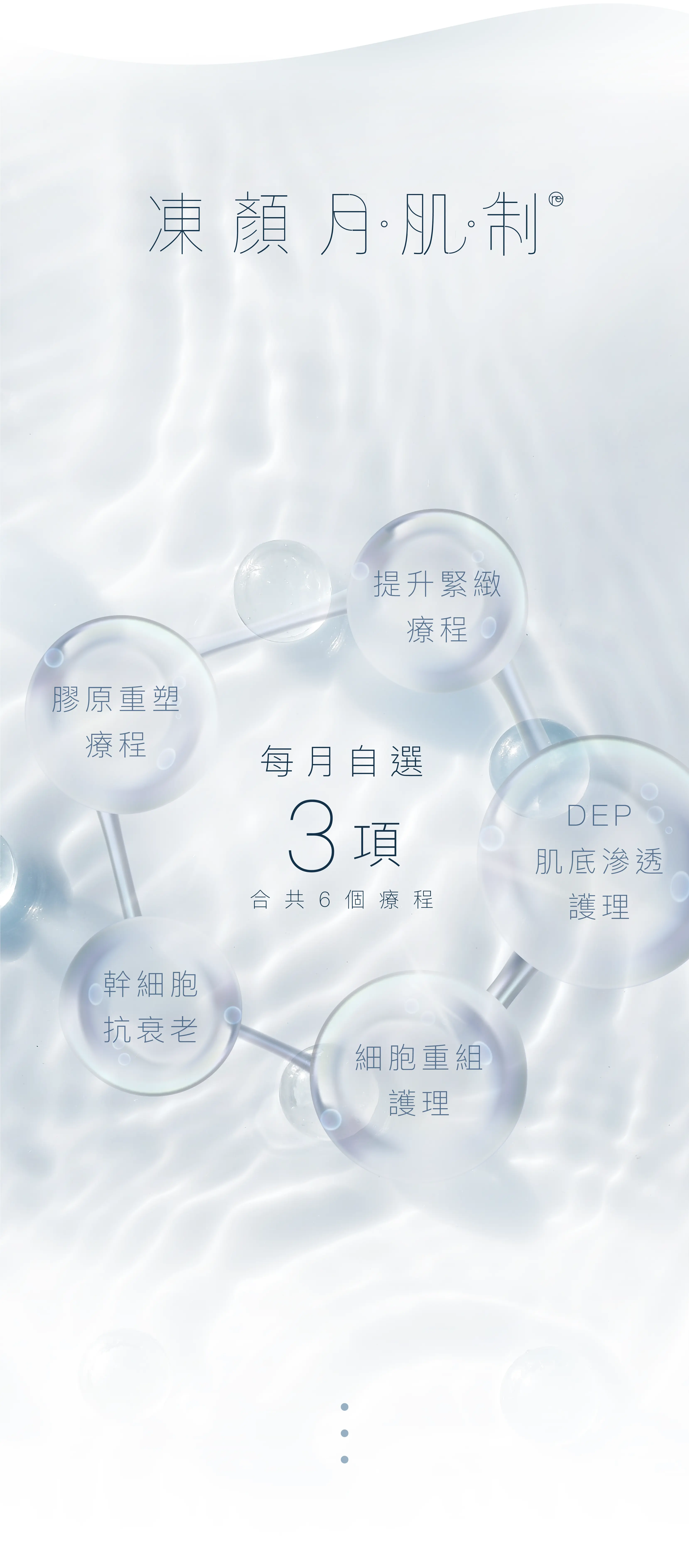 每月可從“月肌制” 的選項中,靈活選擇合適自己面部、頸部、 眼部及身體部位療程,把以往的單一消費,變成個人化的自主消費,貼身解決自「肌」問題。